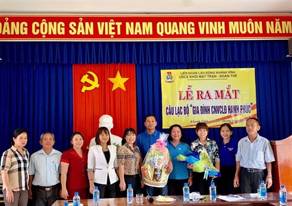 Nhân kỷ niệm 18 năm ngày Gia đình Việt Nam (28/6/2001-28/6/2019); Chiều ngày 27/6, Liên đoàn Lao động huyện Khánh Vĩnh tổ chức lễ ra mắt câu lạc bộ "Gia đình CNVCLĐ hạnh phúc Công đoàn cơ sở Khối Mặt trận - Đoàn thể huyện”. Tham dự có các đồng chí: Hồ Thị Phương Chi - Trưởng Ban Nữ công LĐLĐ tỉnh, Ca Tông Thị Mến –Trưởng Ban Tổ chức Huyện ủy, Nguyễn Thị Việt - Chủ tịch LĐLĐ huyện và 20 thành viên tham gia câu lạc bộ.