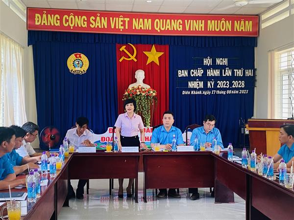 Mới đây, Liên đoàn Lao động (LĐLĐ) huyện Diên Khánh tổ chức Hội nghị Ban Chấp hành lần thứ 02, nhiệm kỳ 2023-2028. Tham dự và chỉ đạo Hội nghị có đồng chí Trần Thị Hương – Phó Chủ tịch Liên đoàn Lao động tỉnh Khánh Hòa, đồng chí Võ Duy Trúc - Ủy viên Ban Thường vụ- Trưởng Ban Chính sách pháp luật và Quan hệ lao động Liên đoàn Lao động tỉnh Khánh Hòa và các đồng chí Ủy viên Ban Chấp hành, Ủy viên UBKT LĐLĐ huyện khóa XII, nhiệm kỳ 2023-2028.