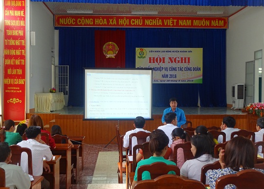 Nhằm trang bị những kiến thức, kỹ năng cơ bản về nghiệp vụ Công đoàn cho cán bộ Công đoàn cơ sở sau Đại hội. Mới đây, Liên đoàn Lao động huyện phối hợp Trung tâm Bồi dưỡng chính trị huyện Khánh Sơn khai mạc lớp tập huấn nghiệp vụ Công đoàn cho 120 cán bộ CĐCS là Chủ tịch, Phó chủ tịch, Kế toán, cán bộ phụ trách UBKT Công đoàn cơ sở.