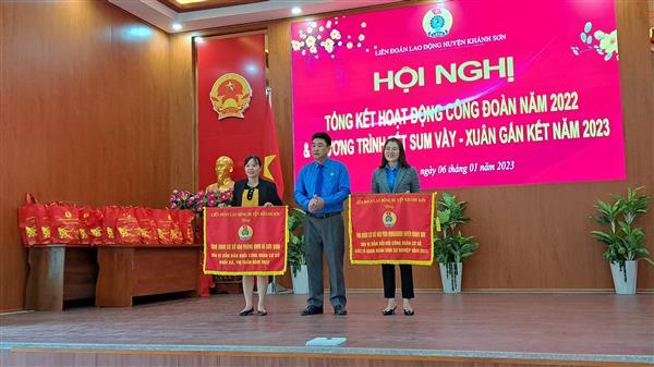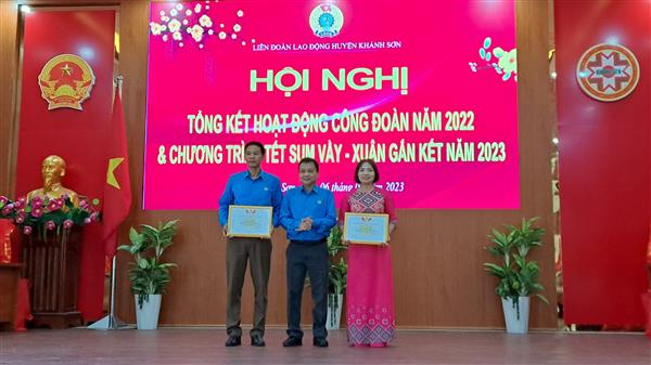 Dịp này, LĐLĐ huyện đã tổ chức Chương trình "Tết sum vầy-Xuân gắn kết" năm 2023, trao 100 suất quà cho đoàn viên có hoàn cảnh khó khăn của các CĐCS (mỗi suất trị giá 500.000 đồng). Hội nghị cũng đã trao Bằng khen của LĐLĐ tỉnh Khánh Hòa cho 6 tập thể và 2 cá nhân: trao giấy khen của LĐLĐ huyện cho 8 tập thể và 25 cá nhân có thành tích xuất sắc trong công tác công đoàn năm 2022.