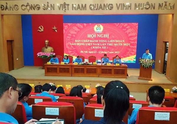 Sáng 13/7/2022, tại Hà Nội đã diễn ra Hội nghị Ban Chấp hành Tổng Liên đoàn Lao động (LĐLĐ) Việt Nam lần thứ 11 (khóa XII). Đồng chí Nguyễn Đình Khang - Ủy viên BCH Trung ương Đảng, Chủ tịch Tổng LĐLĐ và các đồng chí Phó Chủ tịch Tổng LĐLĐ chủ trì hội nghị.