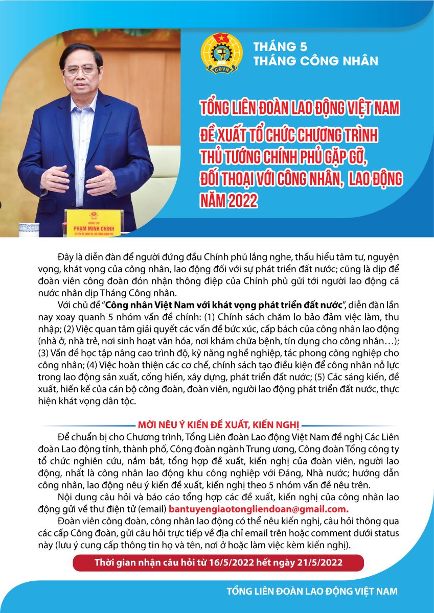 Từ 16 đến 21/5/2022, các cấp Công đoàn và cơ quan báo chí Công đoàn sẽ nắm bắt, tổng hợp các đề xuất, kiến nghị của đoàn viên, công nhân lao động với Đảng, Nhà nước.