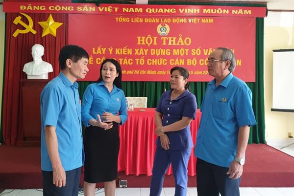 Tại hội thảo, các đại biểu đã tập trung góp ý cho các dự thảo: Hướng dẫn xây dựng danh mục vị trí việc làm cơ quan LĐLĐ cấp tỉnh, CĐ ngành trung ương và CĐ cấp trên trực tiếp cơ sở; sửa đổi, bổ sung hướng dẫn số 1931/HD-TLĐ ngày 27-12-2014 về đánh giá, xếp loại CĐ cấp cơ sở; dự thảo quy định của Đoàn Chủ tịch Tổng LĐLĐ Việt Nam về mối quan hệ giữa CĐ ngành và LĐLĐ tỉnh, Thành phố... Đồng chí Trần Văn Thuật - Phó Chủ tịch Tổng LĐLĐ Việt Nam nhấn mạnh: Tình trạng cán bộ Công đoàn ở cấp cơ sở và cấp trên trực tiếp cơ sở còn nhiều biến động đã gây nhiều khó khăn cho công tác tổ chức và đào tạo hiện nay. Vì thế công tác tổ chức cán bộ Công đoàn cần có sự tiếp nối nhưng phải phù hợp tình hình mới và từng giai đoạn.