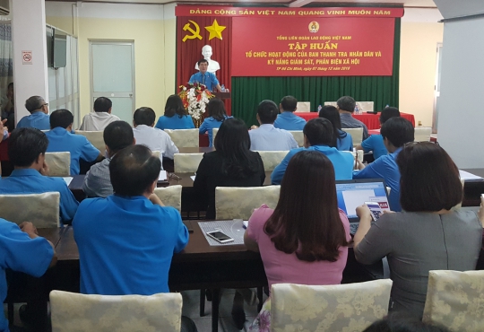 Sáng ngày 7/12/2018, tại văn phòng B Tổng LĐLĐ Việt Nam – TP. Hồ Chí Minh, Tổng LĐLĐ Việt Nam khai mạc lớp tập huấn tổ chức và hoạt động của Thanh tra nhân dân và kỹ năng giám sát, phản biện xã hội. Tham dự và phát biểu khai mạc có Đồng chí Bùi Văn Cường - Chủ tịch Tổng LĐLĐ Việt Nam cùng 70 đại biểu là lãnh đạo phụ trách chuyên đề và cán bộ CĐ chuyên trách LĐLĐ các tỉnh phía Nam.