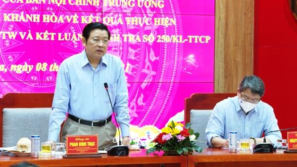 Sau khi nghe báo cáo của tỉnh và các ý kiến phát biểu của các đại biểu dự họp, đồng chí Phan Đình Trạc đánh giá, thời gian qua, tỉnh Khánh Hòa đã tích cực thực hiện các kiến nghị của Ủy ban Kiểm tra Trung ương và Thanh tra Chính phủ nhưng còn nhiều tồn tại, vướng mắc cần phải khẩn trương, quyết liệt hơn. Đồng chí yêu cầu Thường trực Tỉnh ủy Khánh Hòa tập trung lãnh đạo, chỉ đạo các cơ quan chức năng khẩn trương tiếp tục thực hiện các kiến nghị của Ủy ban Kiểm tra Trung ương và của Thanh tra Chính phủ; các cơ quan chức năng ở Trung ương bám sát để chỉ đạo, hướng dẫn các cơ quan chức năng địa phương phối hợp chặt chẽ, đồng bộ, kịp thời tháo gỡ khó khăn, vướng mắc, đẩy nhanh tiến độ xác minh, điều tra, xử lý nghiêm các tổ chức, cá nhân vi phạm theo đúng tinh thần chỉ đạo của đồng chí Tổng Bí thư Nguyễn Phú Trọng, Trưởng Ban Chỉ đạo Trung ương về phòng, chống tham nhũng: “Tích cực, khẩn trương, rõ đến đâu xử lý đến đó; có dấu hiệu phạm tội thì phải khởi tố, điều tra; kết luận có tội thì phải truy tố, xét xử theo quy định của pháp luật”; “không có vùng cấm, không có ngoại lệ”,“không chịu sức ép của bất kỳ tổ chức, cá nhân nào". Kết quả thực hiện báo cáo Ban Chỉ đạo Trung ương về phòng, chống tham nhũng trước ngày 30/6/2021 để phục vụ Phiên họp thứ 20 của Ban Chỉ đạo.