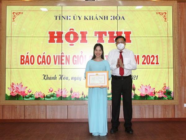 Ban tổ chức đã tặng giấy chứng nhận và khen thưởng cho 16 cá nhân đạt giải gồm 10 giải khuyến khích, 03 giải ba, 02 giải nhì. Giải nhất thuộc về thí sinh Nguyễn Thị Kim Dung - Giáo viên trường THPT Huỳnh Thúc Kháng, huyện Vạn Ninh. Ban tổ chức thống nhất chọn 02 thí sinh Nguyễn Thị Kim Dung (huyện ủy Vạn Ninh) và Nguyễn Minh Cường (Đảng ủy Công an tỉnh) để bồi dưỡng tham gia hội thi khu vực.
