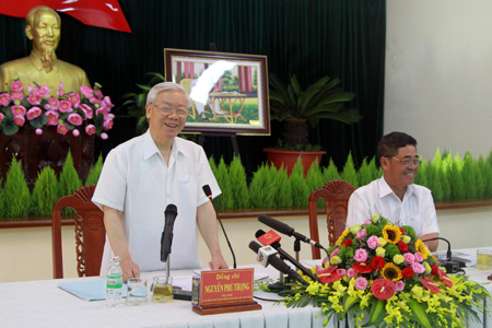 Tổng Bí thư nhấn mạnh, Khánh Hòa còn nhiều tiềm năng, lợi thế cần được phát huy. Tổng Bí thư mong muốn Đảng bộ, nhân dân trong tỉnh tiếp tục phát huy sức mạnh vật chất và tinh thần để khai thác, phát huy những tiềm năng, lợi thế ấy thông qua những việc làm cụ thể, đầu tư có trọng tâm, trọng điểm. Bên cạnh đó, cần có các giải pháp bảo vệ, giữ gìn môi trường để có môi trường thân thiện, xây dựng bản sắc văn hóa riêng cho con người và vùng đất Khánh Hòa, qua đó thu hút các nhà đầu tư và du khách đến với xứ Trầm Hương.