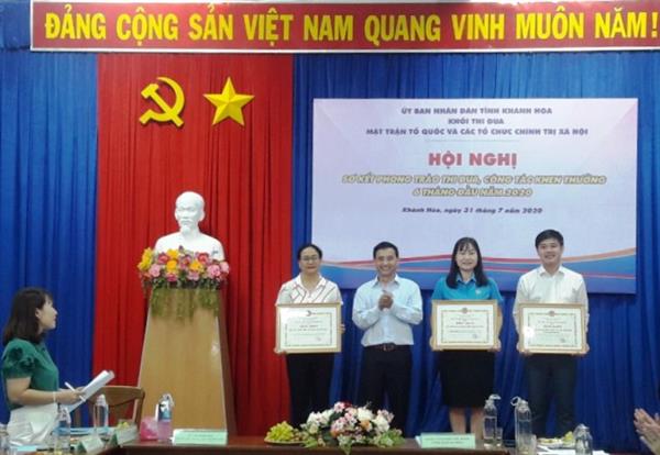 6 tháng đầu năm 2020, các đơn vị trong Khối ra sức thi đua lập thành tích chào mừng Đại hội Đảng các cấp tiến tới Đại hội Đảng toàn quốc lần thứ XIII, nhiệm kỳ 2020-2025, Hội nghị điển hình tiên tiến các cấp tiến tới Đại hội thi đua yêu nước tỉnh Khánh Hòa lần thứ V, giai đoạn 2020-2025 và kỷ niệm các ngày lễ lớn của đất nước… Các đơn vị đã bám sát yêu cầu của công tác thi đua khen thưởng và đặc thù của từng đơn vị; tích cực đổi mới nội dung, phương thức hoạt động để triển khai thực hiện có hiệu quả các phong trào thi đua yêu nước, cuộc vận động, thu hút đông đảo đoàn viên, hội viên tham dự. Trong công tác thi đua khen thưởng, các đơn vị chú trọng đến việc khen thưởng các đối tượng là người lao động trực tiếp, có sáng kiến thực sự mang lại hiệu quả cao trong lao động sản xuất, khởi nghiệp… góp phần động viên, cổ vũ những tập thể, cá nhân tiêu biểu trong các phong trào thi đua. Các đơn vị vận động đoàn viên, hội viên tích cực tham gia các hoạt động phát triển kinh tế, giảm nghèo, văn hóa xã hội, nhân đạo từ thiện; các hoạt động giữ gìn trật tự an toàn xã hội, an ninh tổ quốc; tham gia xây dựng Đảng, chính quyền vững mạnh; góp phần hoàn thành tốt nhiệm vụ chính trị đề ra, thực hiện có hiệu quả các mục tiêu phát triển kinh tế - xã hội của tỉnh. Hoạt động của Khối đề ra được các đơn vị tham gia đầy đủ và nghiêm túc.