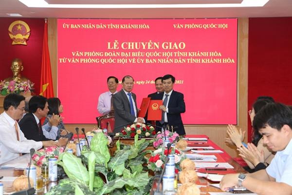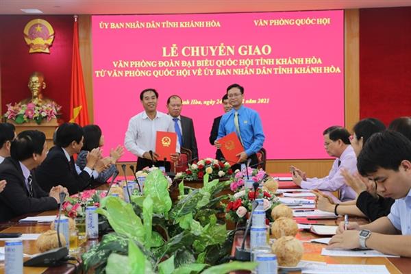 Chiều 24/02/2021, Văn phòng Quốc hội và UBND tỉnh tổ chức lễ chuyển giao văn phòng đoàn đại biểu quốc hội tỉnh về UBND tỉnh Khánh Hòa. Về dự có các đồng chí: Nguyễn Mạnh Hùng – Phó Chủ nhiệm Văn phòng Quốc hội; Nguyễn Khắc Định – UV Trung ương Đảng, Bí thư Tỉnh ủy; Nguyễn Tấn Tuân – Phó Bí thư Tỉnh ủy, Chủ tịch UBND tỉnh.