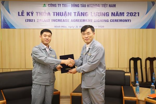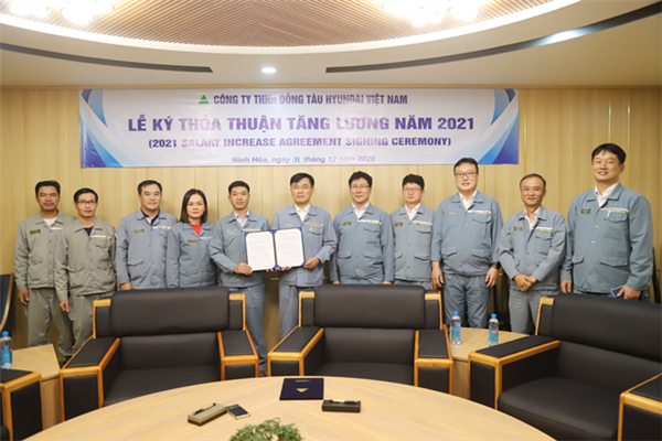 Chiều ngày 31/12/2020, Ban chấp hành Công đoàn cơ sở và lãnh đạo Công ty TNHH Đóng tàu Hyundai Việt Nam đã ký thỏa thuận tăng lương năm 2021 cho người lao động (NLĐ).