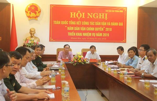 Sáng ngày 10/1/2019, Ban Dân vận Trung ương và Ban cán sự Đảng Chính phủ tổ chức Hội nghị trực tuyến toàn quốc tổng kết công tác Dân vận và đánh giá “năm dân vận chính quyền” 2018. Các đồng chí: Nguyễn Xuân Phúc –Uỷ viên Bộ Chính trị, Bí thư Ban cán sự đảng Chính phủ, Thủ tướng Chính phủ; Trương Thị Mai, –Uỷ viên Bộ Chính trị, Bí thư Trung ương Đảng, trưởng Ban Dân vận Trung ương; Trương Hòa Bình - Uỷ viên Bộ Chính trị, Phó Thủ tướng Thường trực Chính phủ, đồng chí Điểu Kré, Ủy viên Trung ương Đảng, Phó trưởng Ban Thường trực Ban Dân vận Trung ương dự và chủ trì Hội nghị. Tại điểm cầu Khánh Hòa, đồng chí Nguyễn Tấn Tuân - Phó Bí thư TT Tỉnh Ủy, Chủ tịch HĐND tỉnh; đồng chí Nguyễn Đắc Tài- Ủy viên Ban Thường vụ Tỉnh Ủy –Phó Chủ tịch UBND tỉnh chủ trì.