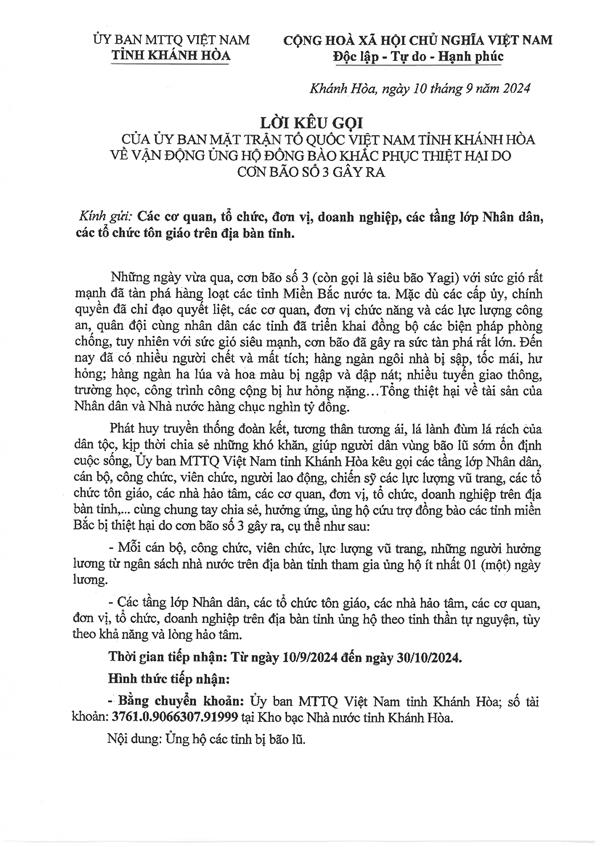 Phát huy truyền thống đoàn kết, tương thân tương ái, lá lành đùm lá rách của dân tộc, kịp thời chia sẻ những khó khăn, giúp người dân vùng bão lũ sớm ổn định cuộc sống, Ủy ban MTTQ Việt Nam tỉnh Khánh Hòa kêu gọi các tầng lớp Nhân dân, cán bộ, công chức, viên chức, người lao động, chiến sĩ các lực lượng vũ trang, các tổ chức tôn giáo, các nhà hảo tâm, các cơ quan, đơn vị, tổ chức, doanh nghiệp trên địa bàn tỉnh,... cùng chung tay chia sẻ, hưởng ứng, ủng hộ cứu trợ đồng bào các tỉnh miền Bắc bị thiệt hại do cơn bão số 3 gây ra, cụ thể như sau: