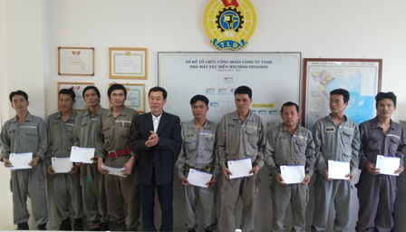 Ngày 12.1, Công đoàn Công ty TNHH Nhà máy tàu biển Hyundai Vinashin (HVS) đã triển khai kế hoạch hỗ trợ tiền cho công nhân ở xa mua vé tàu xe về quê ăn Tết, thăm hỏi những hoàn cảnh đặc biệt khó khăn và tặng quà tết cho toàn thể đoàn viên công đoàn.