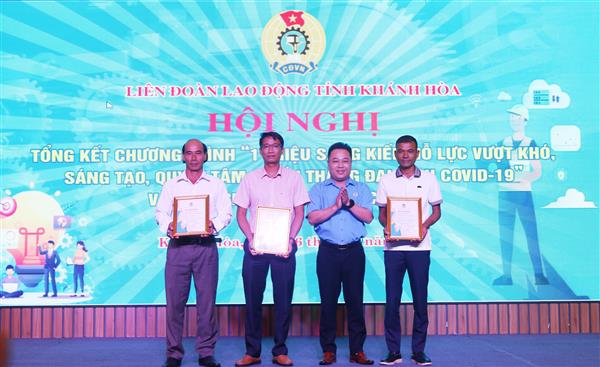 Nhân dịp này, Liên đoàn Lao động tỉnh tặng bằng khen cho 24 tập thể, 19 cá nhân và 12 đề tài tiêu biểu đạt thành tích trong thực hiện Chương trình “1 triệu sáng kiến - nỗ lực vượt khó, sáng tạo, quyết tâm chiến thắng đại dịch Covid-19”; trao chứng nhận cho 159 đề tài, sáng kiến, giải pháp và trao giải thưởng cho 20 đề tài, sáng kiến xuất sắc tham gia hội thi sáng tạo kỹ thuật trong đoàn viên công đoàn, công nhân, viên chức, lao động tỉnh năm 2023; trao giải cho các tác giả, nhóm tác giả đạt giải cuộc thi ảnh báo chí “Nét đẹp công nhân, viên chức, lao động Khánh Hòa” và cuộc thi thiết kế biểu trưng, tranh cổ động, ca khúc chào mừng Đại hội XI Công đoàn Khánh Hòa.