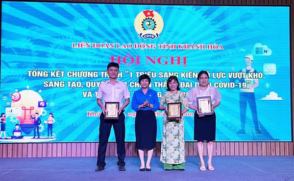 Chương trình “1 triệu sáng kiến - nỗ lực vượt khó, sáng tạo, quyết tâm chiến thắng đại dịch Covid-19” được triển khai từ tháng 1-2022 đến 31-8-2023, toàn tỉnh đã có 10.706 sáng kiến của đoàn viên, người lao động được cập nhật vào hệ thống, đạt 128% chỉ tiêu (vượt 2.406 sáng kiến) đứng thứ 40 toàn quốc về số lượt sáng kiến. Các sáng kiến đã góp phần làm lợi với tổng giá trị gần 200 tỷ đồng. Đối với hội thi sáng tạo kỹ thuật trong đoàn viên công đoàn, công nhân, viên chức, lao động tỉnh năm 2023 đã có 166 đề tài, sáng kiến của 12 công đoàn cấp ngành, huyện và cơ sở tham gia. Liên đoàn Lao động tỉnh đã xét chọn trao 3 giải A, 3 giải B và 9 giải C cho các đề tài, sáng kiến xuất sắc. Về cuộc thi ảnh báo chí “Nét đẹp công nhân, viên chức, lao động Khánh Hòa” được triển khai từ tháng 12-2022 đến hết ngày 31-5-2023 đã nhận được gần 500 tác phẩm dự thi. Ban tổ chức đã chấm sơ khảo và lựa chọn được 100 tác phẩm đủ điều kiện đăng trên fanpage Công đoàn Khánh Hòa. Trên cơ sở đó, Ban tổ chức xét chọn trao 1 giải nhất, 2 giải nhì, 3 giải ba và 10 giải khuyến khích cho các tác giả. Còn về cuộc thi thiết kế biểu trưng, tranh cổ động, ca khúc chào mừng Đại hội XI Công đoàn Khánh Hòa được triển khai từ tháng 2 đến hết ngày 31-5-2023 đã nhận được 54 tác phẩm biểu trưng, 33 tác phẩm tranh cổ động, 2 tác phẩm sáng tác ca khúc. Trên cơ sở đó, Ban tổ chức đã xét chọn trao 7 giải khuyến khích cho tác phẩm biểu trưng; trao 1 giải nhất, 1 giải nhì, 1 giải ba cho các tác phẩm tranh cổ động; không trao giải sáng tác ca khúc.