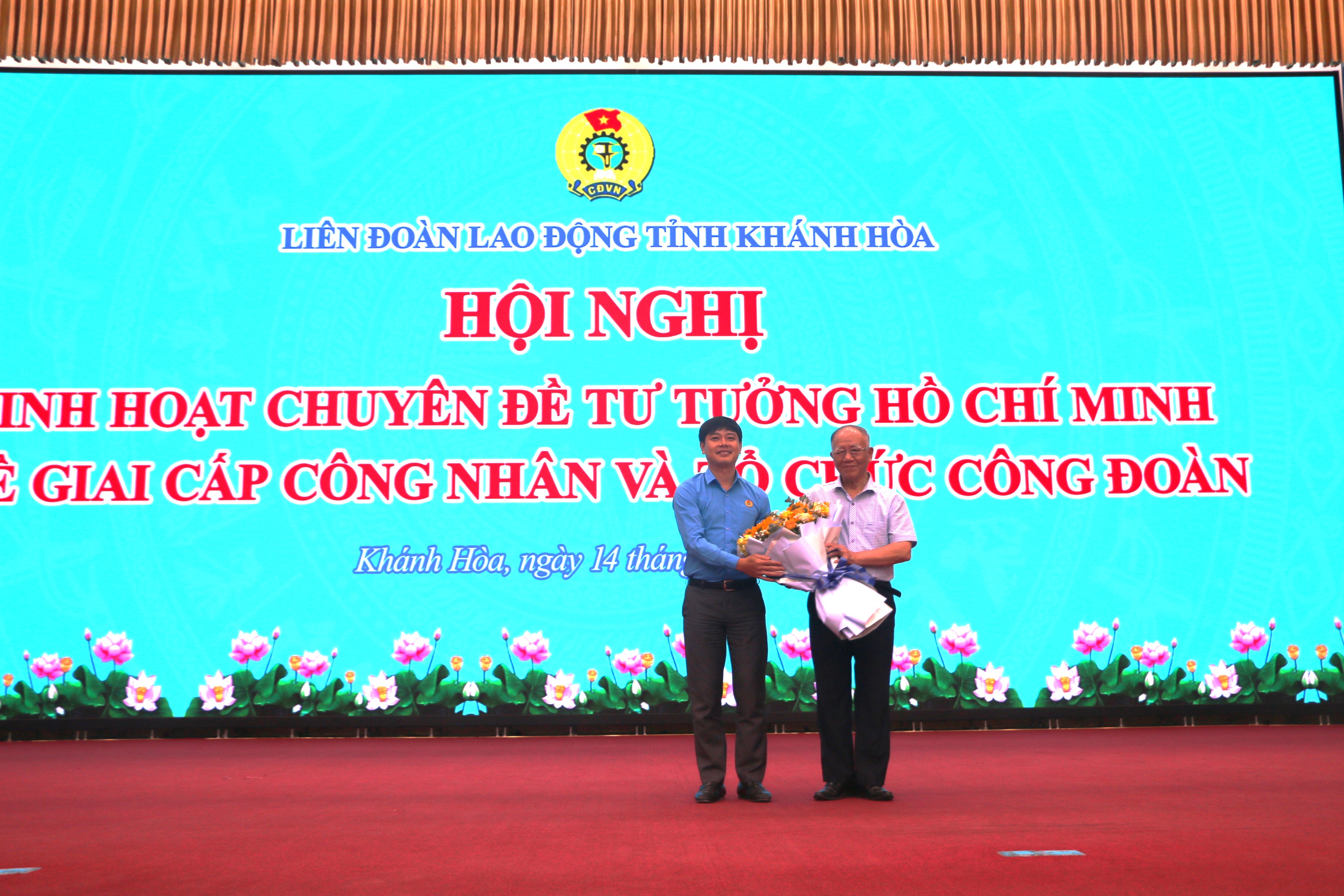 Phát biểu tại Hội nghị, đồng chí Bùi Hoài Nam, Chủ tịch LĐLĐ tỉnh Khánh Hoà nhấn mạnh: “Hội nghị hôm nay hết sức quan trọng, được tổ chức vào thời điểm hướng tới kỷ niệm 95 năm Ngày thành lập Công đoàn Việt Nam (28/7/1929-28/7/2024); những nội dung chia sẻ của Gs Hoàng Chí Bảo đối với đoàn viên, lao động Khánh Hoà tại Hội nghị góp phần củng cố niềm tin, bồi đắp lý tưởng cách mạng, tư tưởng, đạo đức, phong cách Hồ Chí Minh cho công nhân, viên chức, lao động tỉnh toàn tỉnh; thay mặt Ban Thường vụ LĐLĐ tỉnh đồng chí Bùi Hoài Nam gửi lời tri ân đến Giáo sư Hoàng Chí Bảo đã truyền tải những thông tin quý báu về Chủ tịch Hồ Chí Minh cho cán bộ công đoàn Khánh Hòa, hứa sẽ quyết tâm ra sức thi đua, rèn luyện, lan tỏa những giá trị và tư tưởng của Chủ tịch Hồ Chí Minh vĩ đại vào thực tiễn, hành động của công đoàn các cấp.