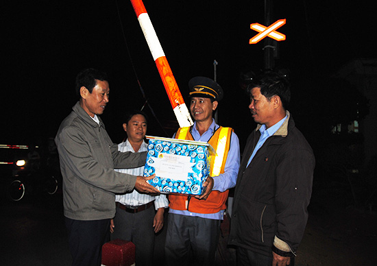 Phó Chủ tịch LĐLĐ tỉnh Lê Xuân Hải tặng quà cho CN gác chắn tàu Bắc Nam
