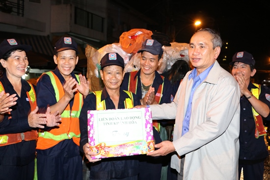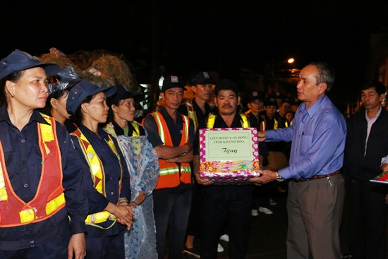Tối ngày 24.1 (tức 27 Tết), đoàn công tác của Liên đoàn Lao động tỉnh Khánh Hòa do đồng chí Nguyễn Hòa – UVBCH Tổng LĐLĐVN, Tỉnh ủy viên, Chủ tịch LĐLĐ tỉnh, cùng lãnh đạo LĐLĐ TP. Nha Trang đã đến thăm, tặng quà và chúc Tết CNLĐ Công ty CP Môi trường Đô thị Nha Trang tại Điểm tập kết rác chợ Xóm Mới và đường Lê Hồng Phong.