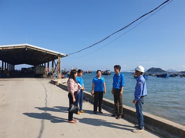 Lãnh đạo LĐLĐ huyện và CĐN Nông nghiệp - PTNT trao đổi với Nghiệp đoàn tại Cảng cá Đại Lãnh