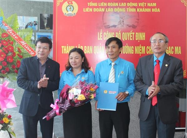 Theo đó, chủ tịch Tổng Liên đoàn Lao động Việt Nam Nguyễn Đình Khang đã ký quyết định về việc thành lập Ban quản lý Khu tưởng niệm chiến sỹ Gạc Ma trực thuộc LĐLĐ tỉnh Khánh Hòa. Ban quản lý là đơn vị sự nghiệp công đoàn do Ban thường vụ LĐLĐ Khánh Hòa trực tiếp quản lý, chỉ đạo; có tư cách pháp nhân, con dấu và tài khoản riêng, được đảm bảo chi thường xuyên theo quy định của pháp luật và của Tổng liên đoàn.