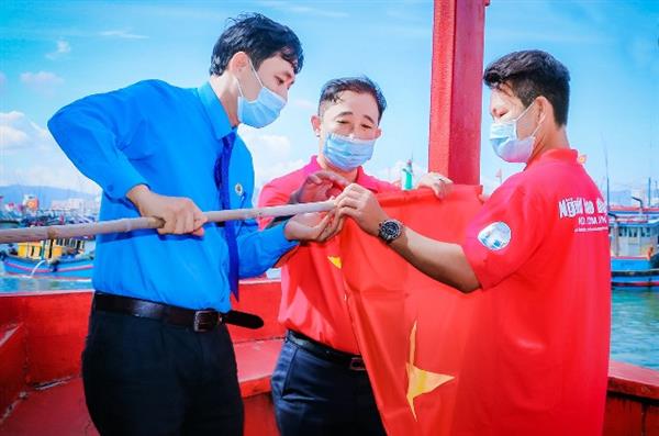 Đ/c Bùi Thanh Bình - Chủ tịch LĐLĐ tỉnh tặng cờ Tổ quốc cho ngư dân Cảng cá Hòn Rớ