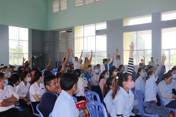 Gần 200 công nhân rất hào hứng tham gia phần giao lưu văn nghệ, đoán tên và hát lại 12 đoạn ca khúc , mỗi câu trả lời đúng sẽ được Ban Tổ chức tặng phần quà trị giá 200.000đ. Bên cạnh đó, đoàn viên, công nhân lao động tham gia phần thi trắc nghiệm về An toàn giao thông với 12 câu hỏi, mỗi câu trả lời đúng công nhân nhận một phần quà.