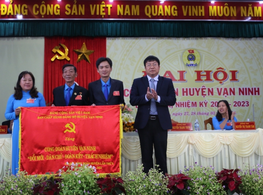Đ/c Võ Hoàn Hải - Bí thư Huyện ủy tặng Bức trướng cho Đại hội Công đoàn Vạn Ninh