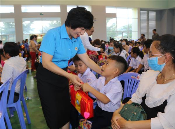 Đ/c Trần Thị Hương - Phó Chủ tịch LĐLĐ tỉnh tặng bánh và đèn trung thu cho các cháu thiếu nhi