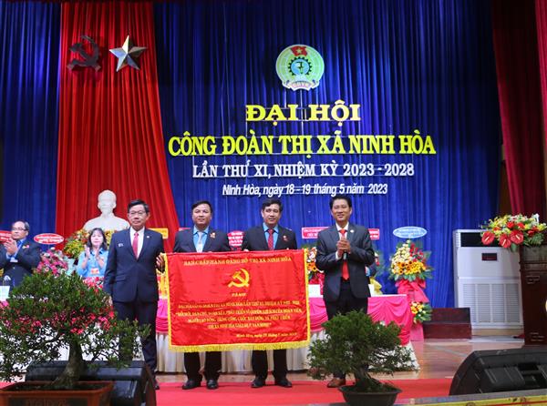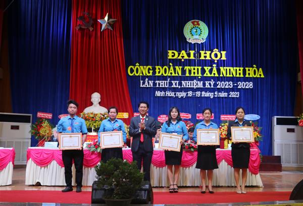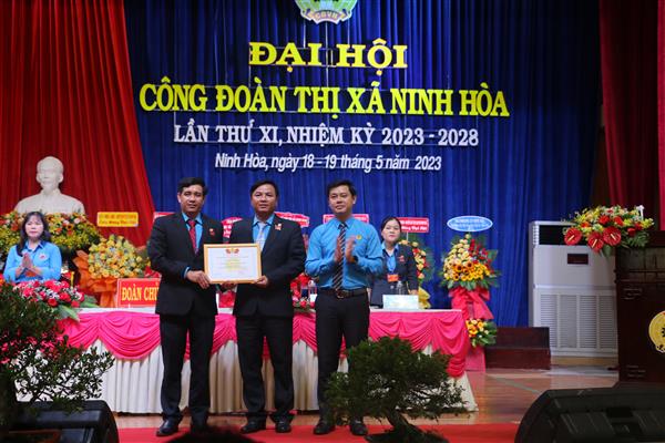 Nhân dịp này, Thị ủy Ninh Hòa trao tặng bức trướng “Đổi mới, dân chủ, đoàn kết, phát triển vì quyền, lợi ích của đoàn viên, người lao động trong công cuộc xây dựng và phát triển thị xã Ninh Hòa giàu đẹp, văn minh” cho Ban Chấp hành LĐLĐ thị xã Ninh Hòa; LĐLĐ tỉnh tặng Bằng khen cho Ban Chấp hành LĐLĐ thị xã Ninh Hòa, trao tặng bằng khen cho 5 tập thể, 5 cá nhân xuất sắc; UBND thị xã khen thưởng 5 tập thể và 10 cá nhân; LĐLĐ thị xã khen thưởng 13 tập thể và 23 cá nhân đã có nhiều thành tích xuất sắc trong xây dựng tổ chức Công đoàn vững mạnh nhiệm kỳ 2018 – 2023.