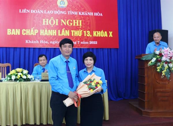 Đ/c Bùi Thanh Bình - Chủ tịch LĐLĐ tỉnh tặng hoa chúc mừng tân Phó Chủ tịch Trần Thị Hương
