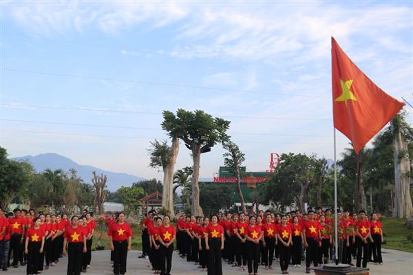 Lãnh đạo doanh nghiệp cùng đoàn viên, NLĐ chào cờ và hát Quốc ca, lan tỏa tình yêu quê hương, đất nước. Ảnh: Phương Linh