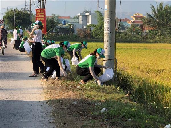 Ngay sau lễ chào cờ và hát Quốc ca, đoàn viên, NLĐ đã chia thành 2 nhóm tổ chức dọn rác thải nhựa tạo cảnh quan môi trường xung quanh tuyến đường vào khu công nghiệp và dọc tuyến đường nhựa từ UBND xã Vĩnh Phương trải dài đến điểm nối Quốc lộ 1 (khoảng 2km).