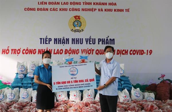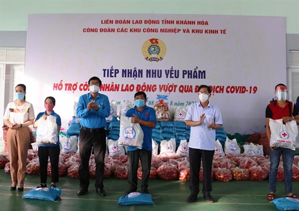 Nhằm kịp thời chia sẻ khó khăn với CNLĐ và doanh nghiệp, chiều 8/8/2021, tại Trung tâm văn hóa, thể thao công nhân, đoàn công tác do đồng chí Nguyễn Tấn Tuân – Phó Bí thư Tỉnh ủy, Chủ tịch UBND tỉnh làm trưởng đoàn đã hỗ trợ 10 tấn nhu yếu phẩm cho CNLĐ Khu Công nghiệp Suối Dầu - huyện Cam Lâm.