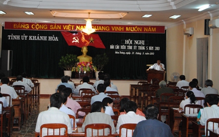 Sáng 31.5, Ban Tuyên giáo Tỉnh ủy tổ chức Hội nghị Báo cáo viên Tỉnh ủy tháng 5 năm 2013. Tại hội nghị các đại biểu đã được quán triệt và được cung cấp những thông tin về những thành tựu, một số khó khăn hạn chế của Việt Nam sau 5 năm gia nhập Tổ chức Thương mại thế giới (WTO) và một số chủ trương giải pháp trong thời gian tới; nghe báo cáo kết luận 60-KL/TW ngày 16/4/2013 của Bộ Chính trị về kết quả sơ kết 5 năm thực hiện Nghị quyết Hội nghị lần thứ tư Ban chấp hành Trung ương Đảng khóa X về Chiến lược biển Việt Nam đến năm 2020; Kết quả Hội nghị Trung ương 7, khóa XI; tình hình thế giới trong thời gian gần đây và định hướng công tác tuyên truyền miệng trong thời gian tới. Trong đó nhấn mạnh một số nhiệm vụ trọng tâm cần tập trung lãnh đạo, chỉ đạo để thực hiện có hiệu quả Nghị quyết Trung ương 4 (Khóa XI) về xây dựng Đảng trong thời gian tới và một số nhiệm vụ cấp bách tháo gỡ khó khăn cho nền kinh tế.