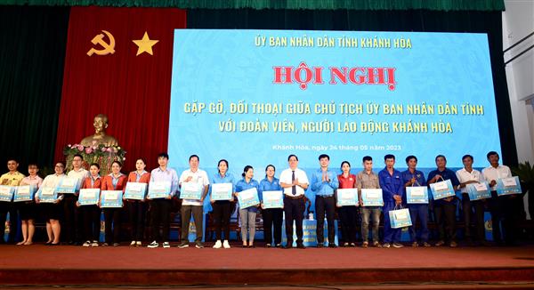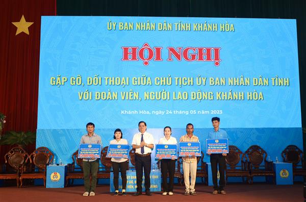 Tại buổi đối thoại, lãnh đạo tỉnh và LĐLĐ tỉnh trao kinh phí hỗ trợ xây nhà “Mái ấm Công đoàn Khánh Hòa” cho 5 trường hợp đoàn viên khó khăn và tặng 100 phần quà cho đoàn viên, người lao động, mỗi suất 1,2 triệu đồng.