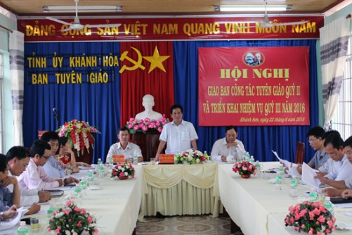 Quý II năm 2016, ngành Tuyên giáo từ tỉnh đến cơ sở đã cơ bản hoàn thành tốt nhiệm vụ được giao như: Tham mưu cấp ủy kế hoạch tổ chức học tập, quán triệt Nghị quyết Đại hội Đảng toàn quốc lần thứ XII; giúp cấp ủy theo dõi việc học tập và làm theo tấm gương đạo đức Hồ Chí Minh; chủ động nắm bắt tình hình tư tưởng, tâm trạng xã hội của cán bộ, đảng viên và nhân dân trên địa bàn tỉnh, nhất là trước, trong và sau ngày bầu cử đại biểu Quốc hội khóa XIV và bầu cử đại biểu Hội đồng nhân dân các cấp nhiệm kỳ 2016 – 2021; tuyên truyền các ngày lễ lớn trong quý II/2016; tuyên truyền biển, đảo... Ngoài ra, Ban Tuyên giáo Tỉnh ủy phối hợp với Trường Đại học Nha Trang giúp Ban Thường vụ Tỉnh ủy tổ chức thành công Hội thảo khoa học “Nghiên cứu, triển khai thực hiện Nghị quyết Đại hội Đảng bộ tỉnh Khánh Hòa lần thứ XVII về phát triển giáo dục - đào tạo giai đoạn 2015 - 2020”.