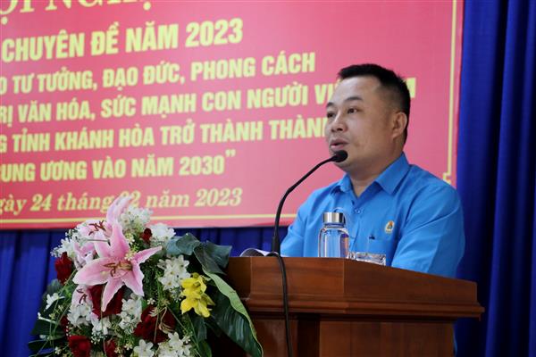 Hội nghị được đồng chí Nguyễn Đức Trí - Phó Chủ tịch LĐLĐ tỉnh quán triệt 2 nội dung chính của chuyên đề: Tư tưởng Hồ Chí Minh và đường lối của Đảng về phát huy giá trị văn hóa, sức mạnh con người Việt Nam trong sự nghiệp xây dựng và bảo vệ Tổ quốc; Học tập và làm theo tư tưởng, đạo đức, phong cách Hồ Chí Minh về phát huy giá trị văn hóa, sức mạnh con người Khánh Hòa gắn với khát vọng xây dựng tỉnh trở thành thành phố trực thuộc Trung ương vào năm 2030.