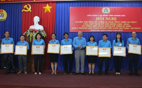 Ngày 6/9, Liên đoàn Lao động tỉnh Khánh Hòa tổ chức hội nghị tuyên truyền, kỷ niệm 50 năm thực hiện Di chúc của Chủ tịch Hồ Chí Minh; tổng kết hoạt động Tháng công nhân và hoạt động kỷ niệm 90 năm ngày thành lập Công đoàn Việt Nam (28/7/1929-28/7/2019). Đồng chí Nguyễn Hòa – Chủ tịch LĐLĐ tỉnh cùng gần 100 cán bộ công đoàn tham dự.