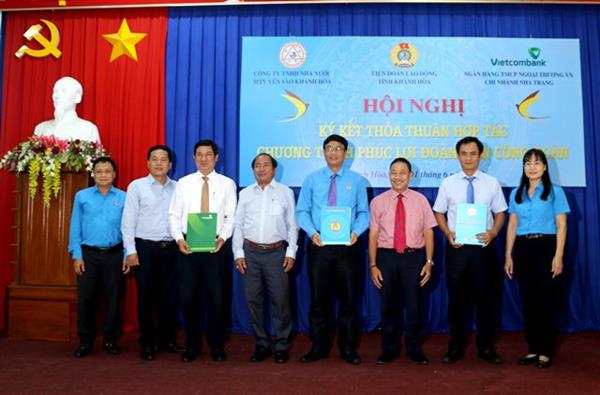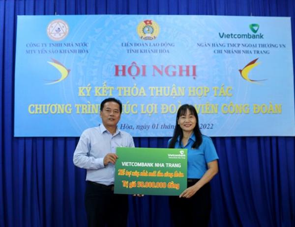 Theo thỏa thuận với Ngân hàng Vietcombank chi nhánh Nha Trang, hàng năm, LĐLĐ tỉnh và Vietcombank Nha Trang thống nhất các nội dung chương trình ưu đãi cho đoàn viên công đoàn khi sử dụng Thẻ đoàn viên thực hiện chính sách cho vay vốn ngân hàng với lãi suất ưu đãi; giảm giá áp dụng mới khi mua sắm và thanh toán bằng Thẻ đoàn viên. Bên cạnh đó, Vietcombank sẽ thăm, tặng quà đoàn viên, người lao động bị tai nạn lao động, bị bệnh nghề nghiệp nhân dịp Tháng Công nhân; hỗ trợ Chương trình Tết Sum vầy 50 suất quà mỗi suất trị giá từ 500.000đ - 1.000.000đ/suất; hỗ trợ xây mới 01 nhà Mái ấm Công đoàn trị giá 50.000.000đ/nhà.
