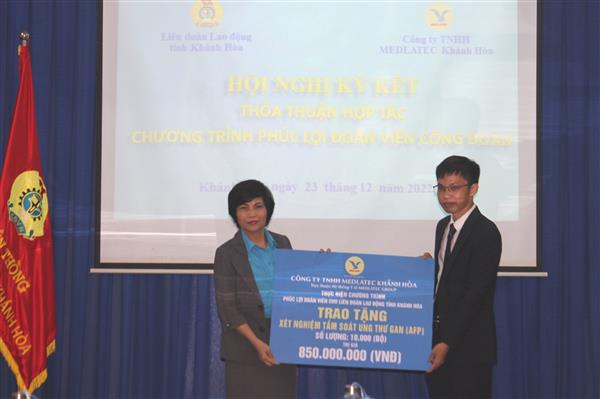 Theo Thỏa thuận hợp tác, Công ty TNHH MEDLATEC Khánh Hòa xây dựng các cơ chế chính sách ưu đãi chăm sóc sức khỏe dành riêng cho đoàn viên, người lao động trên địa bàn tỉnh, cụ thể: Hỗ trợ 10.000 bộ xét nghiệm tầm soát ung thư gan và bác sĩ tư vấn sức khỏe miễn phí cho 10.000 đoàn viên, người lao động; giảm giá 10% các dịch vụ xét nghiệm khác đối với đoàn viên, người lao động khi sử dụng dịch vụ của công ty lần kế tiếp.