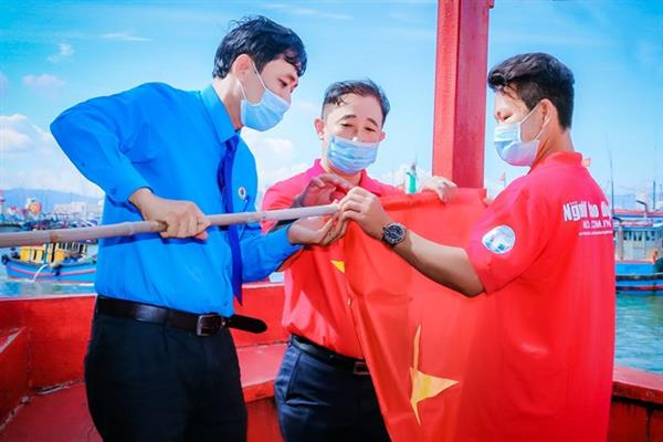 Đồng chí Bùi Thanh Bình - Chủ tịch LĐLĐ tỉnh (áo xanh) trao cờ Tổ quốc cho ngư dân Cảng cá Hòn Rớ
