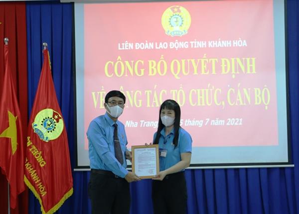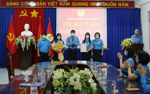 Tại buổi công bố, Ban Tổ chức LĐLĐ tỉnh công bố các Quyết định về công tác tổ chức, cán bộ: Quyết định số 120/QĐ-LĐ, ngày 29/6/2021 về việc thành lập Ban Tuyên giáo – Nữ công, Quyết định bổ nhiệm Trưởng Ban Tuyên giáo – Nữ công đối với đồng chí Lê Thị Minh Hiền, Quyết định bổ nhiệm Phó Trưởng Ban Tuyên giáo – Nữ công, Quyết định bổ nhiệm chức vụ Phó Giám đốc Nhà Văn hóa Lao động tỉnh đối với đồng chí Nguyễn Thị Phương Thủy. Thời gian giữ chức vụ là 05 năm tính từ ngày 01/7/2021.