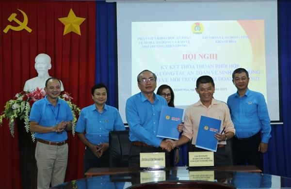 Chiều 14/6/2019, đại diện LĐLĐ tỉnh Chủ tịch Nguyễn Hòa và Phân viện trưởng Khoa học ATVSLĐ và bảo vệ môi trường miền Trung Nhan Hồng Quang đã chủ trì và ký kết thỏa thuận hợp tác về công tác ATVSLĐ và bảo vệ môi trường trên địa bàn tỉnh Khánh Hòa, nhằm hỗ trợ tối đa việc chăm lo, bảo vệ quyền và lợi ích hợp pháp cho đoàn viên và người lao động.