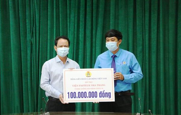 Đồng chí Bùi Thanh Bình - Chủ tịch LĐLĐ tỉnh trao hỗ trợ 100 triệu đồng cho Viện Pasteur Nha Trang
