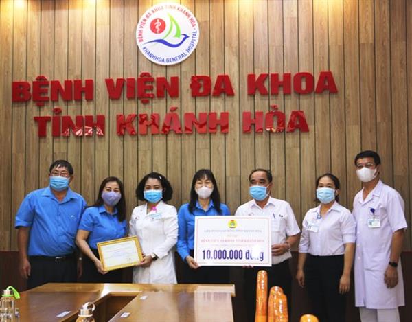 Sáng 2/6, Liên đoàn Lao động tỉnh Khánh Hòa đã đến thăm và trao tặng quà cho các đơn vị y tế tuyến đầu trong công tác phòng, chống dịch Covid-19, trong đó trao 100 triệu đồng cho Viện Pasteur Nha Trang từ nguồn kinh phí của Tổng LĐLĐ Việt Nam, trao 40 triệu đồng cho Bệnh viện Đa khoa tỉnh, Bệnh viện Đa khoa khu vực Ninh Hòa, Trung tâm Y tế huyện Cam Lâm và thị xã Ninh Hòa, mỗi suất 10 triệu đồng/đơn vị.
