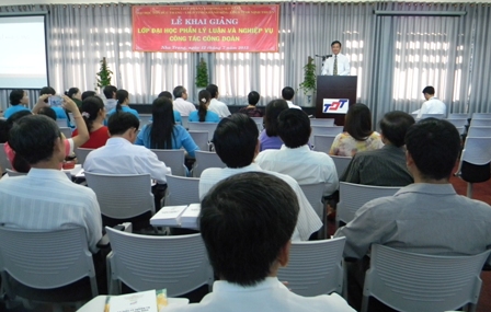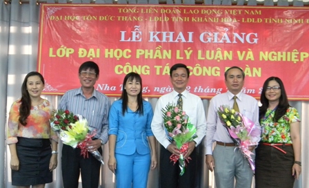 Thực hiện Quyết định số 904/QĐ-TLĐ ngày 29/7/2011 của Tổng Liên đoàn Lao động Việt Nam về việc triển khai chương trình đào tạo “Lý Luận và nghiệp vụ công tác công đoàn”, chiều ngày 12.7.2013, tại Phân hiệu Nha Trang, Trường Đại học Tôn Đức Thắng phối hợp với Liên đoàn Lao động tỉnh Khánh Hòa và Ninh Thuận tổ chức Lễ khai giảng lớp Đại học phần lý luận và nghiệp vụ công đoàn cho 36 cán bộ công đoàn chuyên trách của Liên đoàn Lao động tỉnh Khánh Hòa và Ninh Thuận.