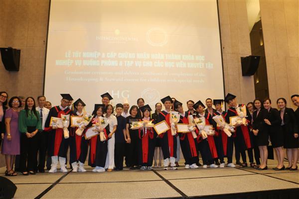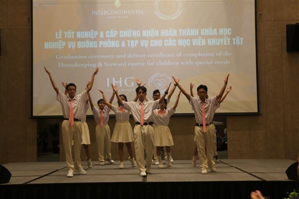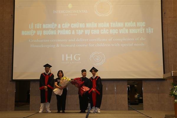 Khoá đào tạo diễn ra 6 tháng, được khách sạn InterContinental Nha Trang tổ chức đào tạo kỹ năng, nghiệp vụ nghề Buồng phòng và Tạp vụ cho 10 học viên khuyết tật thuộc dạng khuyết tật trí tuệ và khiếm thính…Tại buổi lễ các em học viên vui mừng được trao chứng nhận tốt nghiệp và thông báo việc làm có trả lương bán thời gian tại khách sạn. Ông Philip Beriman-Tổng Giám đốc khách sạn InterContinental Nha Trang, cho biết: "Hi vọng chương trình dạy nghề này sẽ lan tỏa thông điệp đến các khách sạn khác ở địa phương trong thời gian tới để tiếp tục đồng hành, hỗ trợ cho các lao động khuyết tật”.