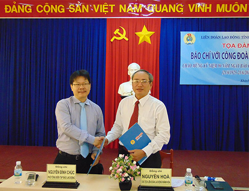 Sáng ngày 18-6, Liên đoàn Lao động tỉnh Khánh Hòa tổ chức tọa đàm “Báo chí với công đoàn Khánh Hòa” nhân kỷ niệm 90 năm ngày Báo chí cách mạng Việt Nam. Đồng thời, ký kết chương trình phối hợp tuyên truyền giai đoạn 2015-2018 với Báo Lao động.