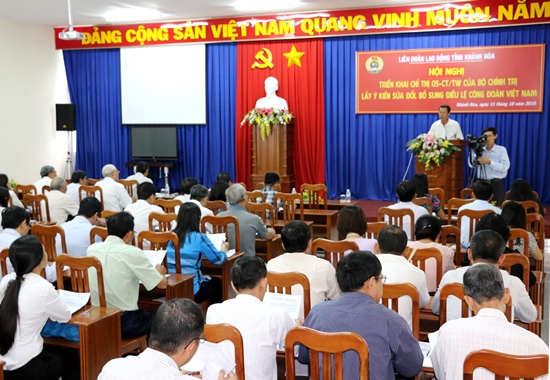 Ngày 11-10, Liên đoàn Lao động tỉnh Khánh Hòa đã tổ chức hội nghị triển khai thực hiện Chỉ thị 05-CT/TW ngày 15/5/2016 của Bộ Chính trị về đẩy mạnh học tập và làm theo tư tưởng, đạo đức, phong cách Hồ Chí Minh trong hệ thống tổ chức Công đoàn và lấy ý kiến sửa đổi, bổ sung Điều lệ Công đoàn Việt Nam. Phó Chủ tịch LĐLĐ tỉnh Lê Xuân Hải chủ trì hội nghị.