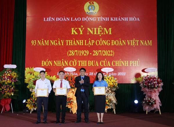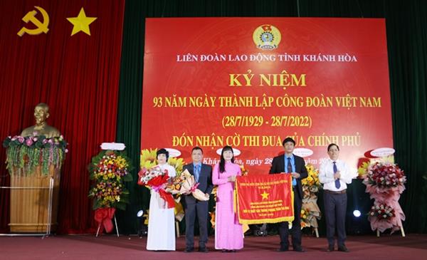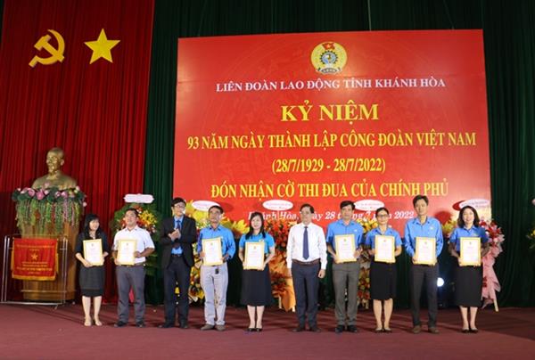Ghi nhận những thành tích đạt được, LĐLĐ tỉnh vinh dự đón nhận Cờ thi đua xuất sắc của Chính phủ; Tổng LĐLĐ Việt Nam tặng bằng khen Lao động sáng tạo cho 8 cá nhân và Kỷ niệm chương "Vì sự nghiệp xây dựng tổ chức Công đoàn" cho 31 cá nhân; LĐLĐ tỉnh Khánh Hòa biểu dương 17 tập thể xuất sắc trong triển khai thực hiện Chương trình "1 triệu sáng kiến - nỗ lực vượt khó, sáng tạo, quyết tâm chiến thắng đại dịch Covid-19" - giai đoạn 1, tặng bằng khen cho 4 tập thể, 9 cá nhân có thành tích trong công tác tuyên truyền phong trào công nhân và hoạt động Công đoàn tỉnh giai đoạn 2021 - 2022; trao tặng kinh phí hỗ trợ xây mới, sửa chữa 16 Mái ấm Công đoàn cho các đoàn viên có hoàn cảnh khó khăn với tổng trị giá 700 triệu đồng.